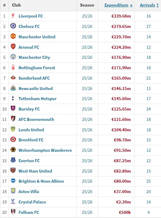 今夏英超各队支出排行榜↓