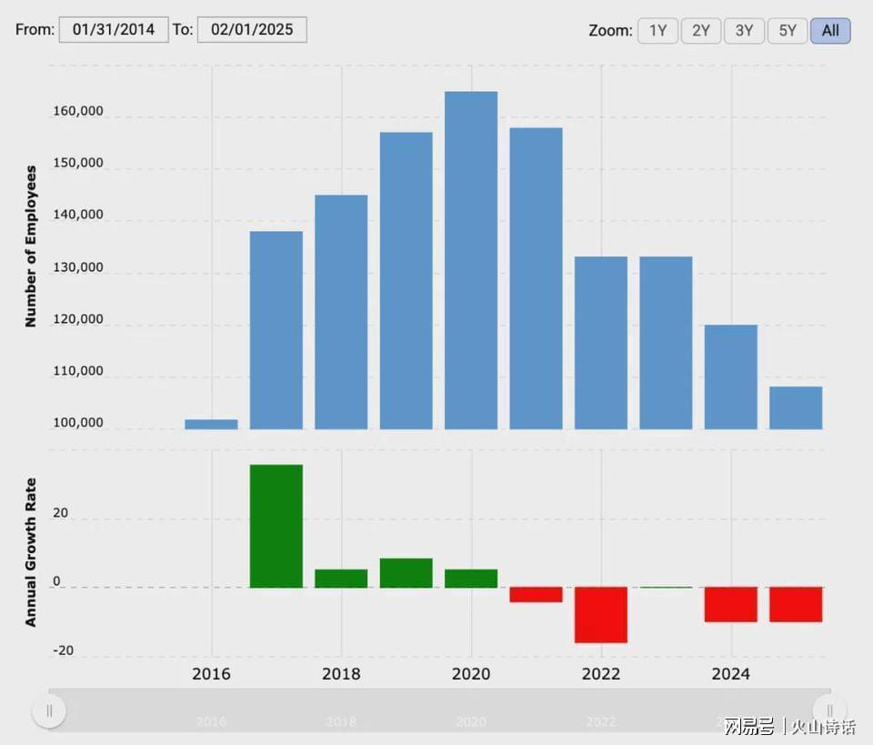 2025 财年(截至 2025 年 1 月 31 日):约108,000名员工(同比下降约10%,减少 12,000 人)。